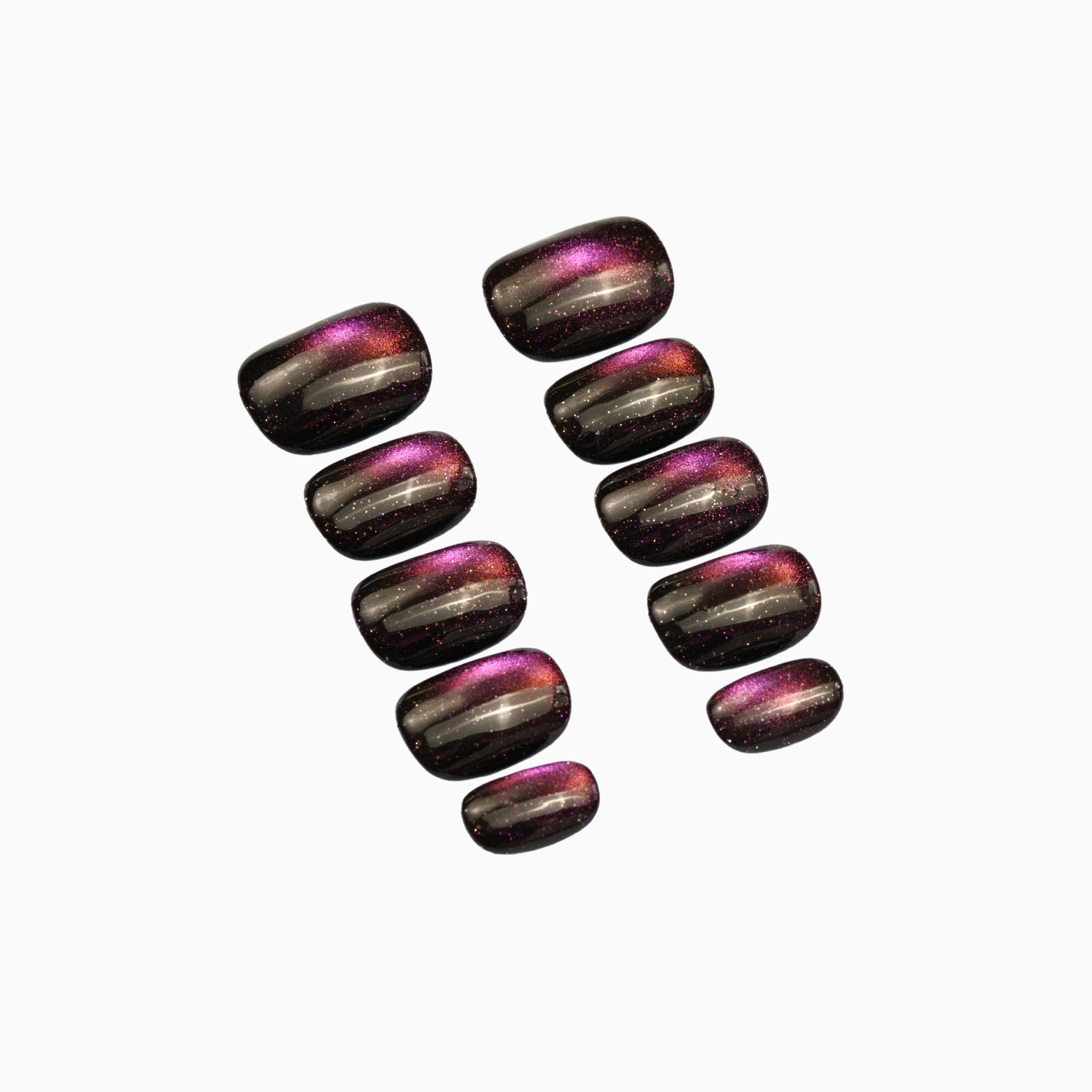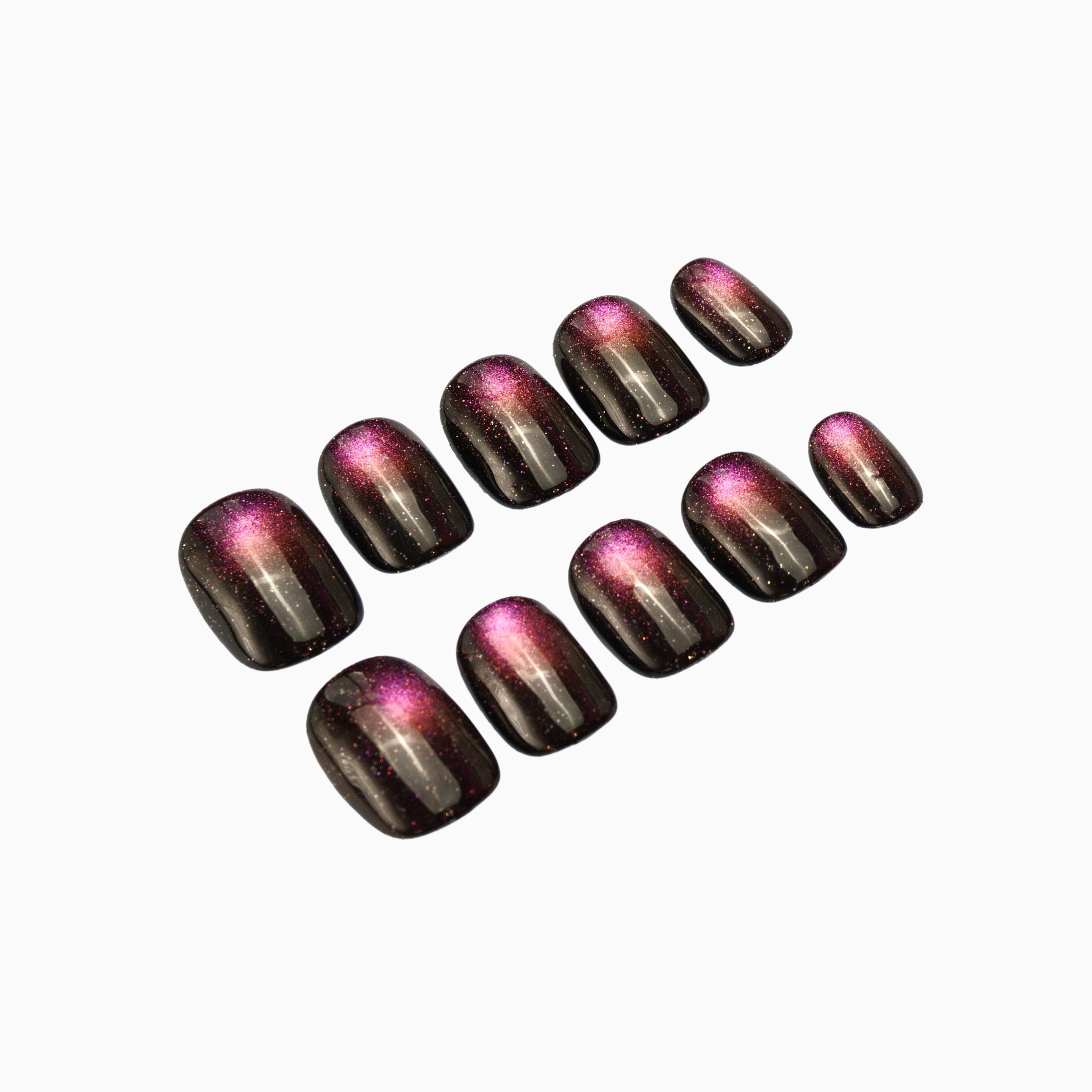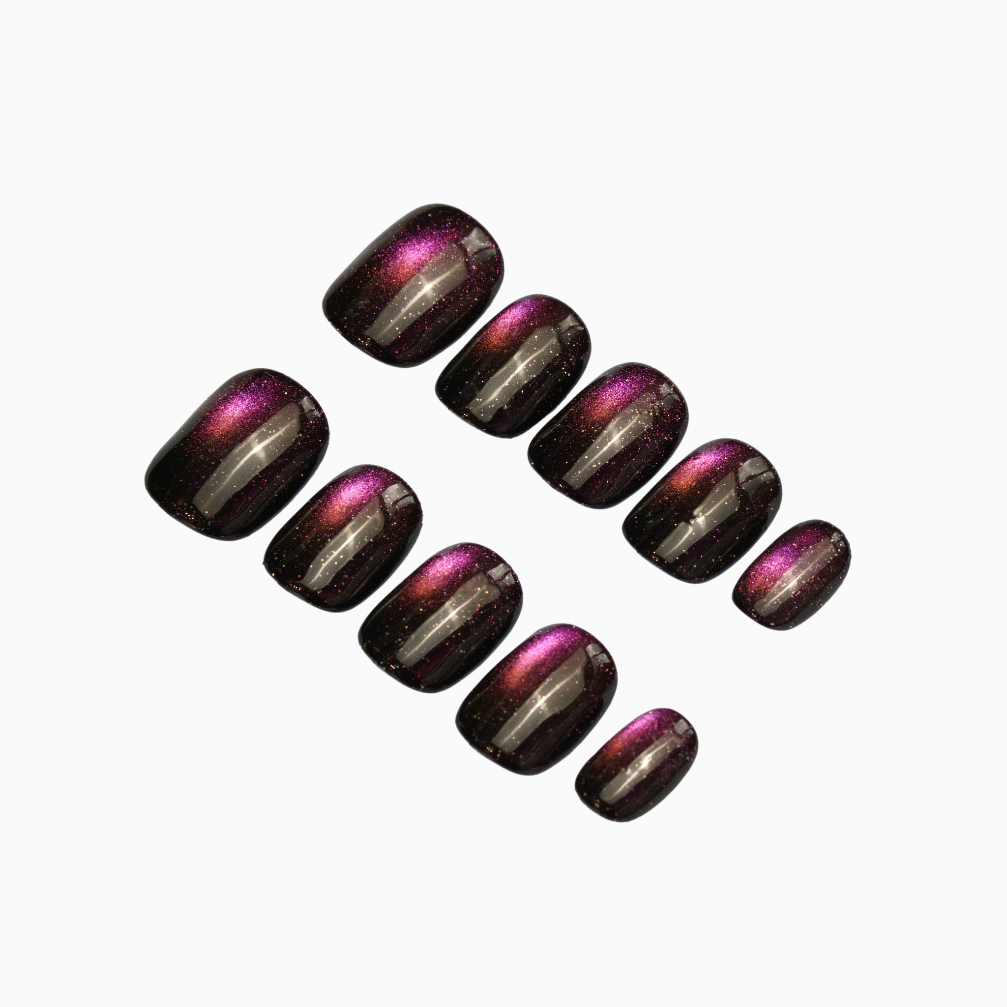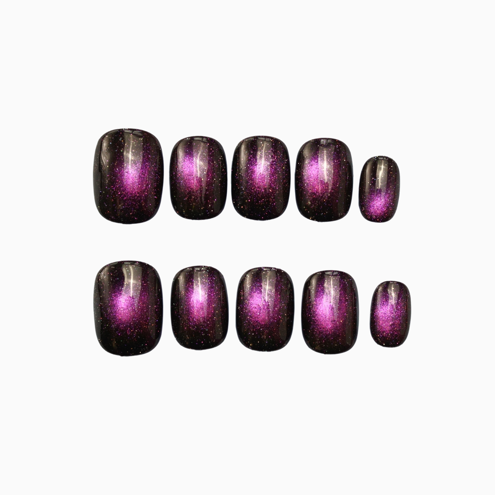 Short square cat eye nails in deep black with radiant pink purple shimmer and scattered stardust sparkle. Hypnotic, futuristic, and perfect for your space-girl era.