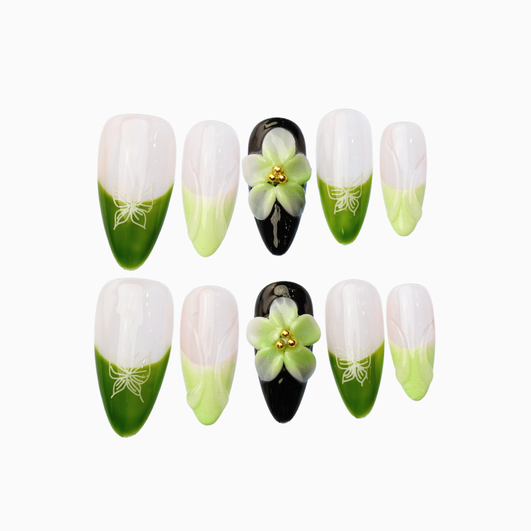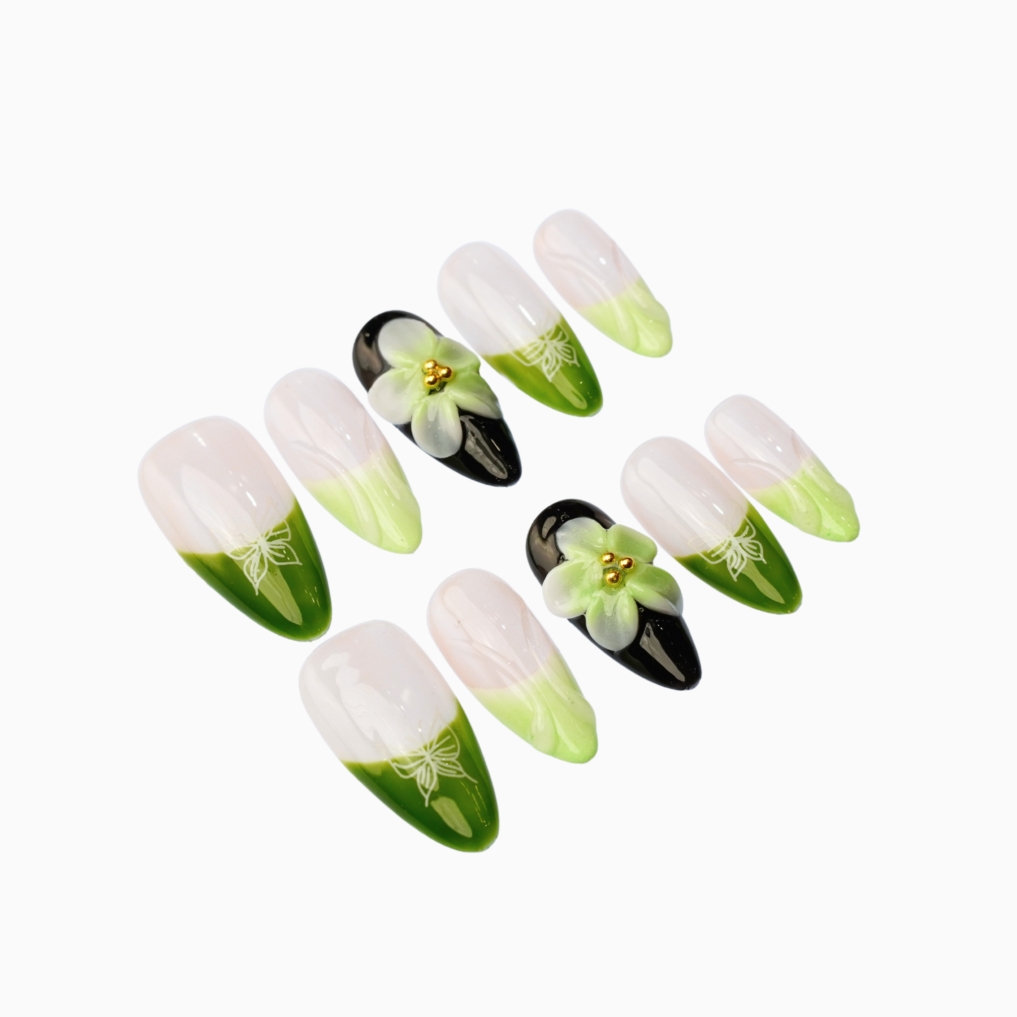 Sage greens meet milky nude in this dreamy forest-inspired set. 3D blossoms and delicate butterflies add just the right amount of whimsy.