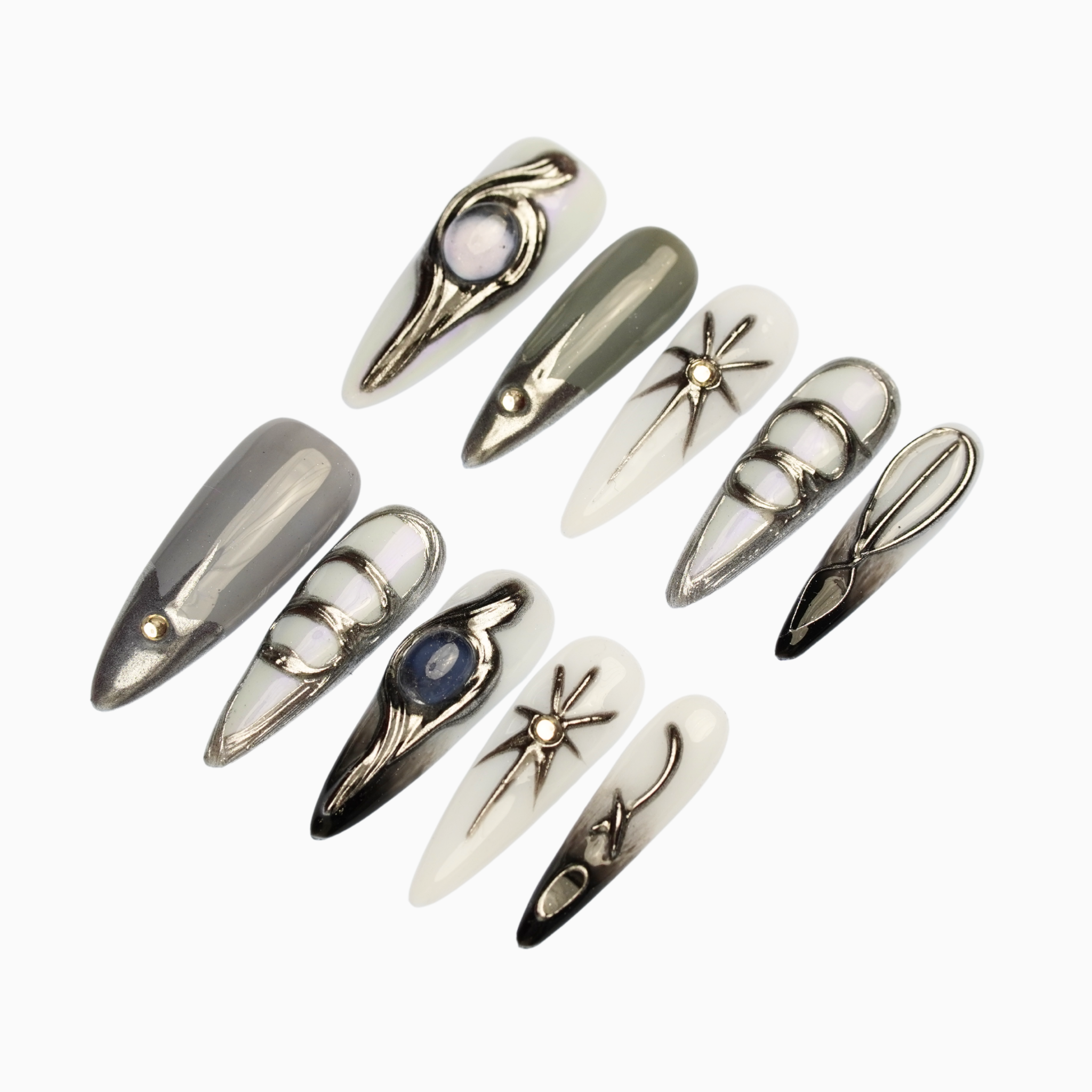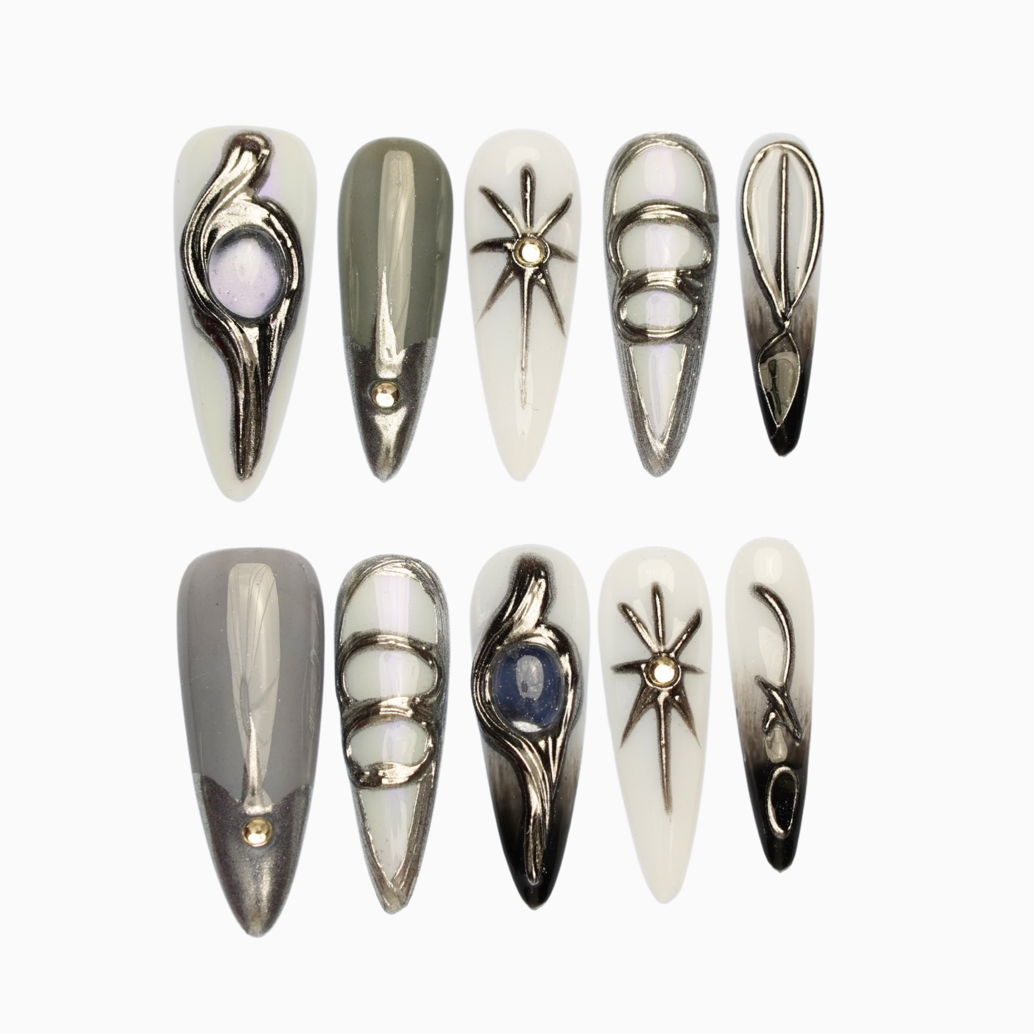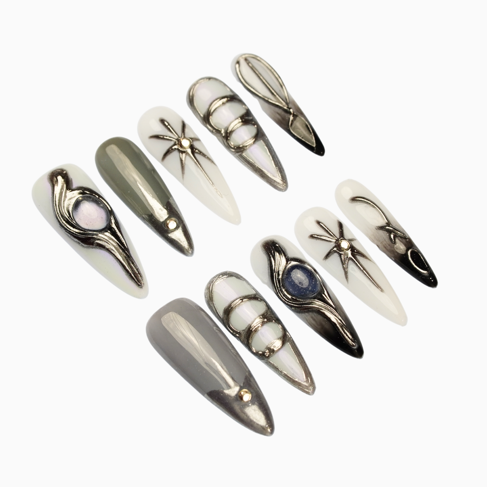 Soft milky tones and smoky greys layered with liquid chrome lines, celestial symbols, and sculptural metallic forms. Futuristic yet restrained, with a polished, architectural finish that feels quietly powerful.