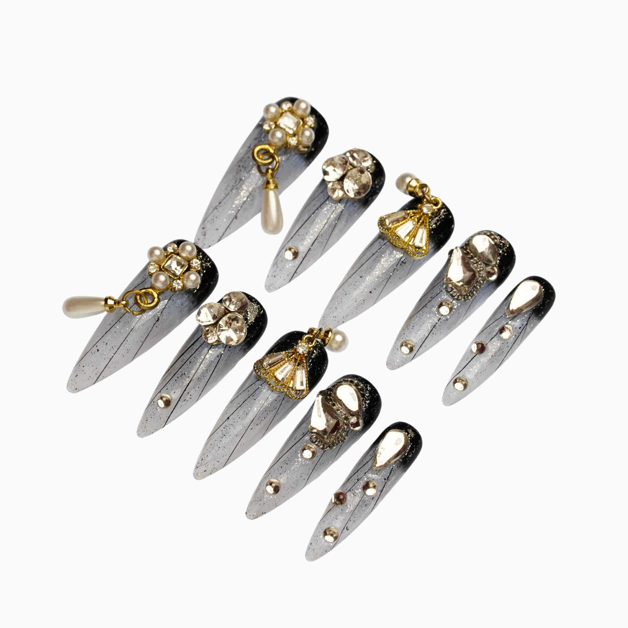 A smoky silver-to-black gradient finished with pearls, crystals, and delicate gold charms. Soft shimmer meets sculptural detail for a quietly opulent finish.