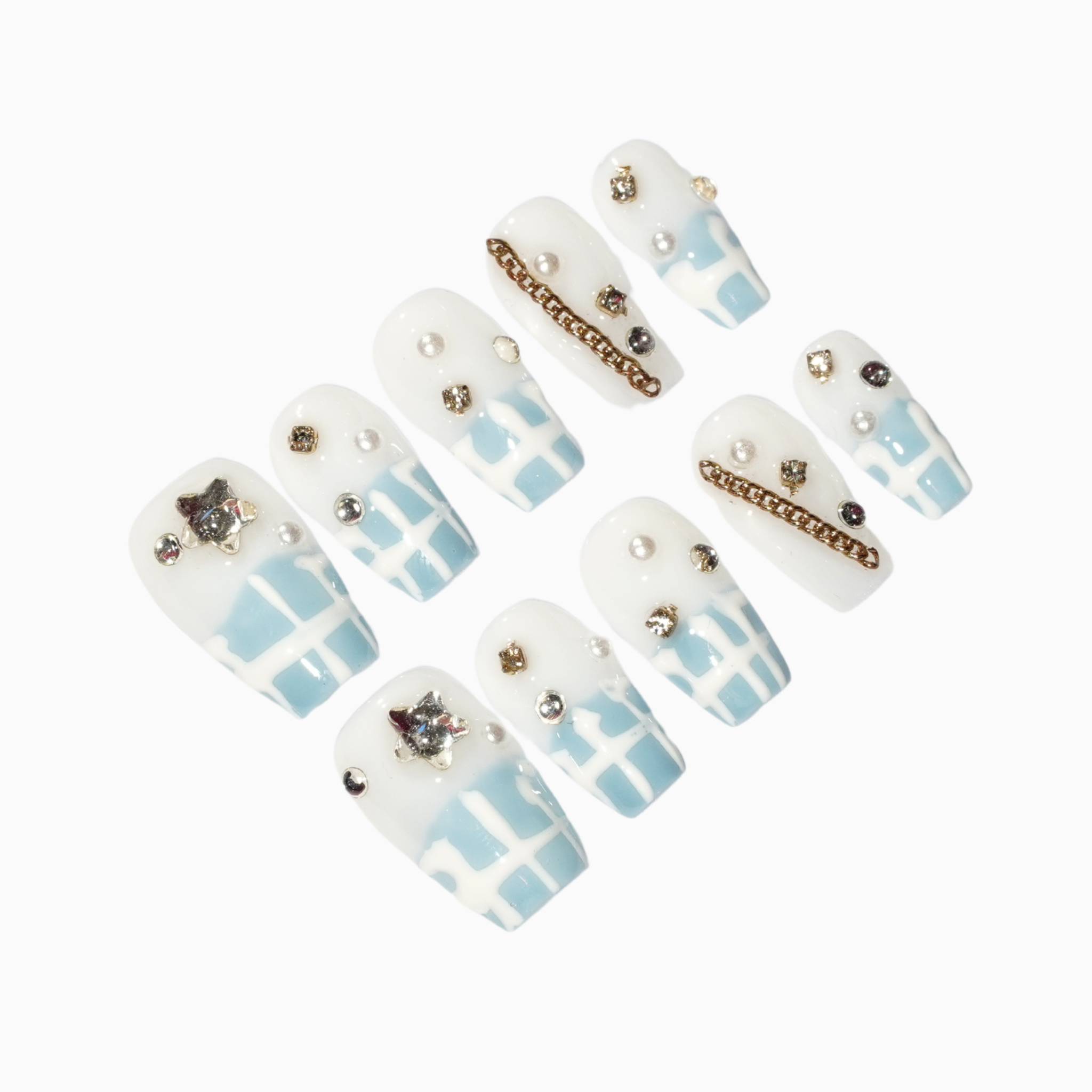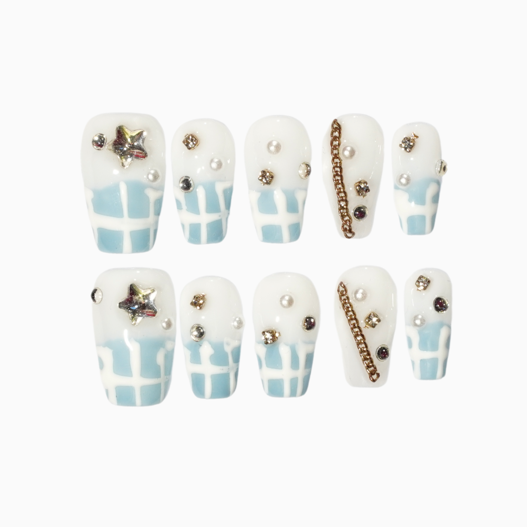Short, coffin style nails with a clear white as the base colour, as well as half the nail bed ending with a clean blue with white stripes atop. Adorned with precious gems such as stars, rhinestones and chains.