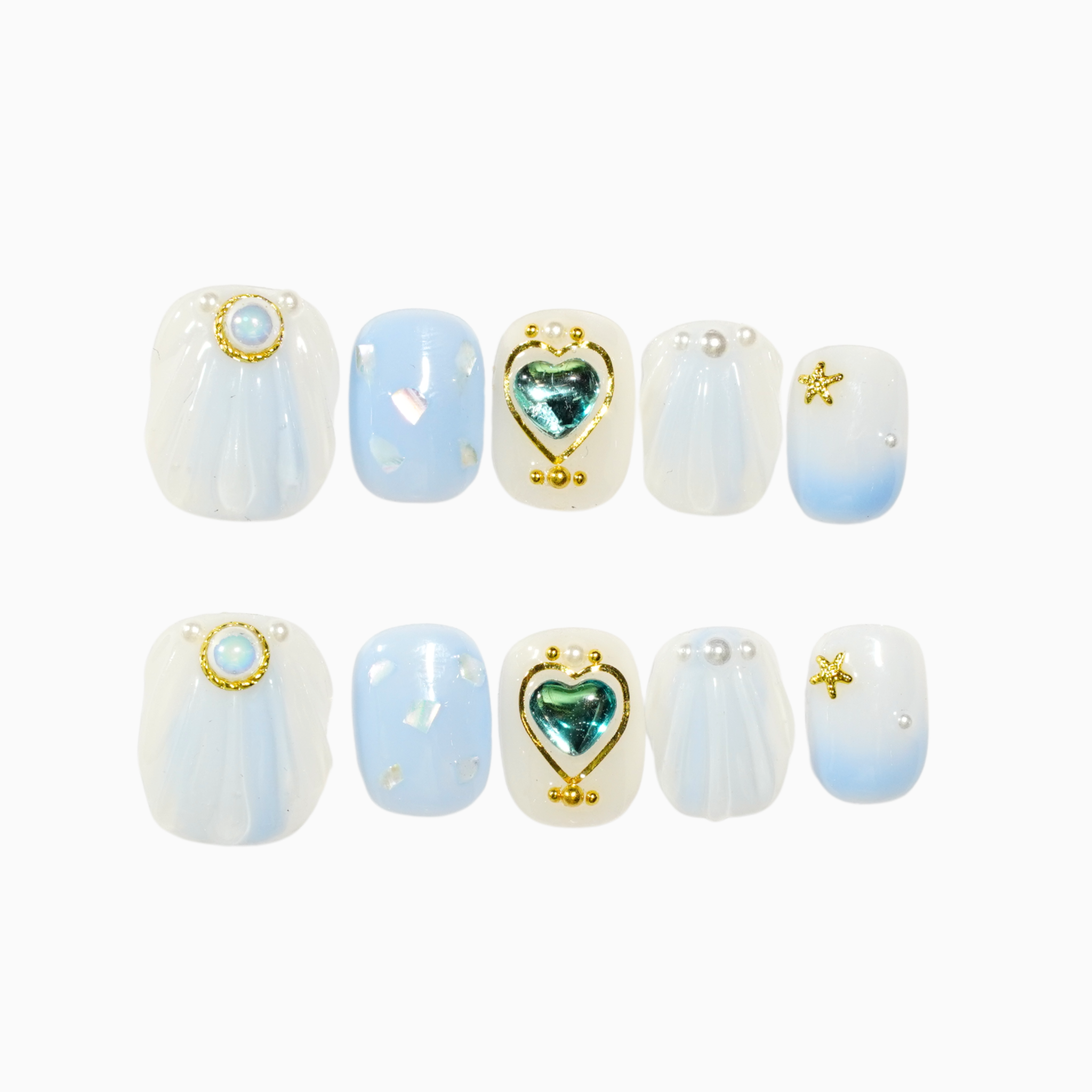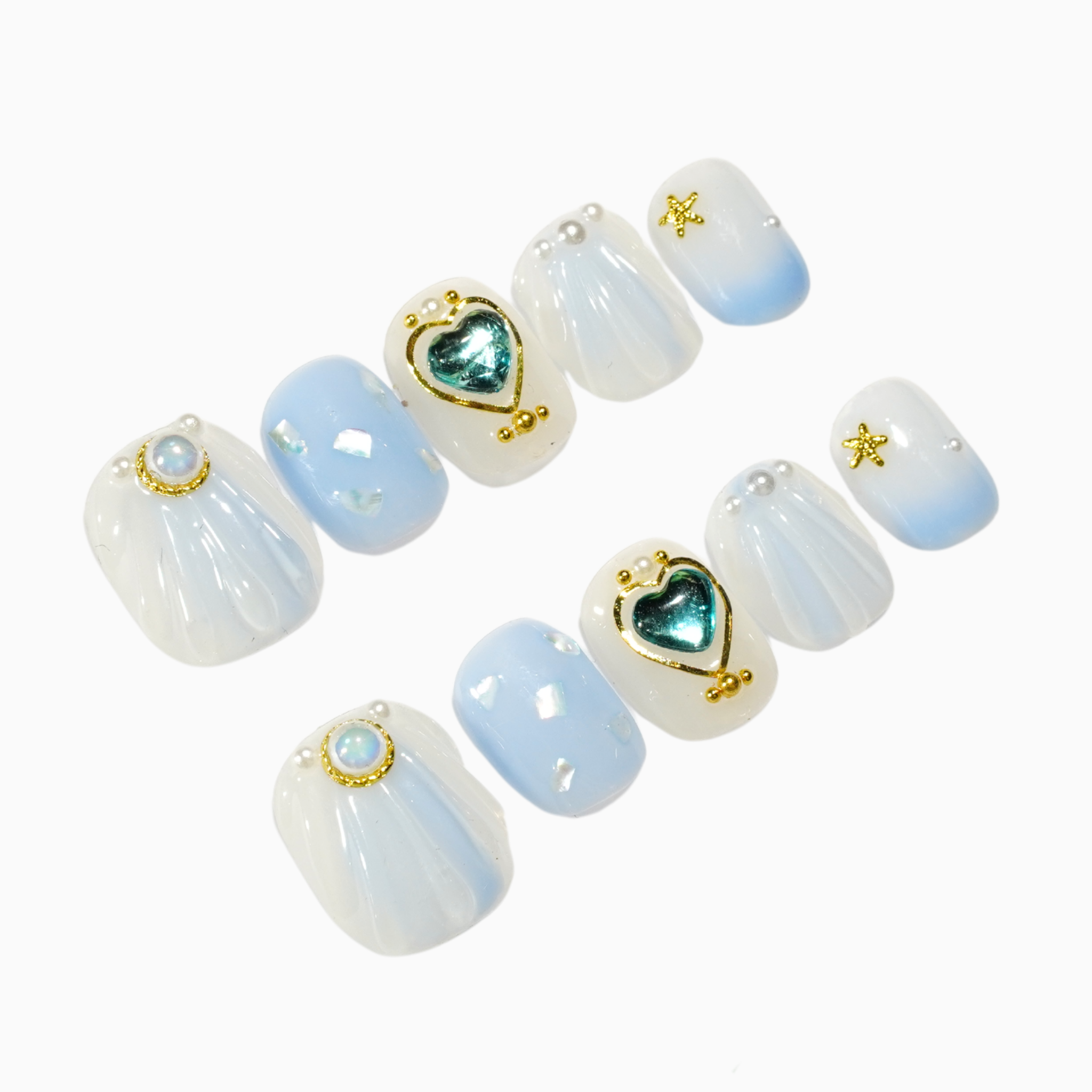 Soft ocean blue with pearl shimmer and golden heart charms — seashell dreams caught under sunlight, gentle and divine.