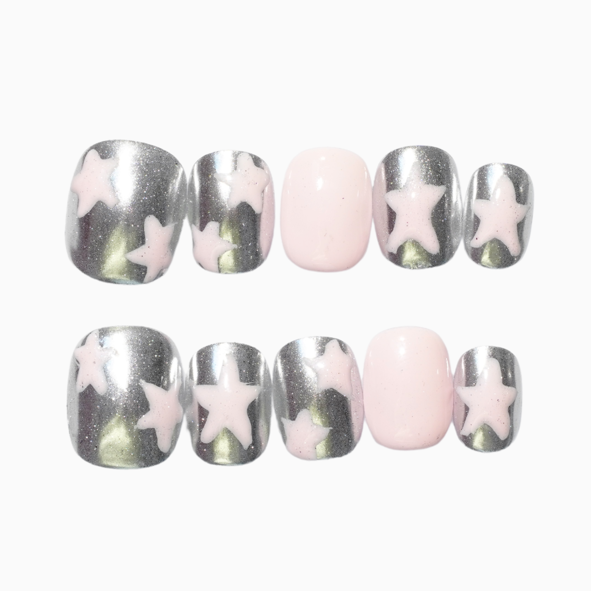 Short style nails with a shiny silver and creamy pink as the base colours. Includes artwork of delicate stars in the same creamy pink.