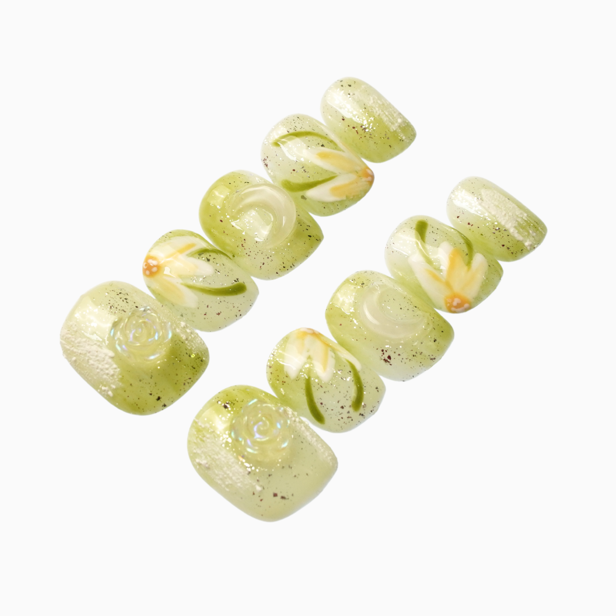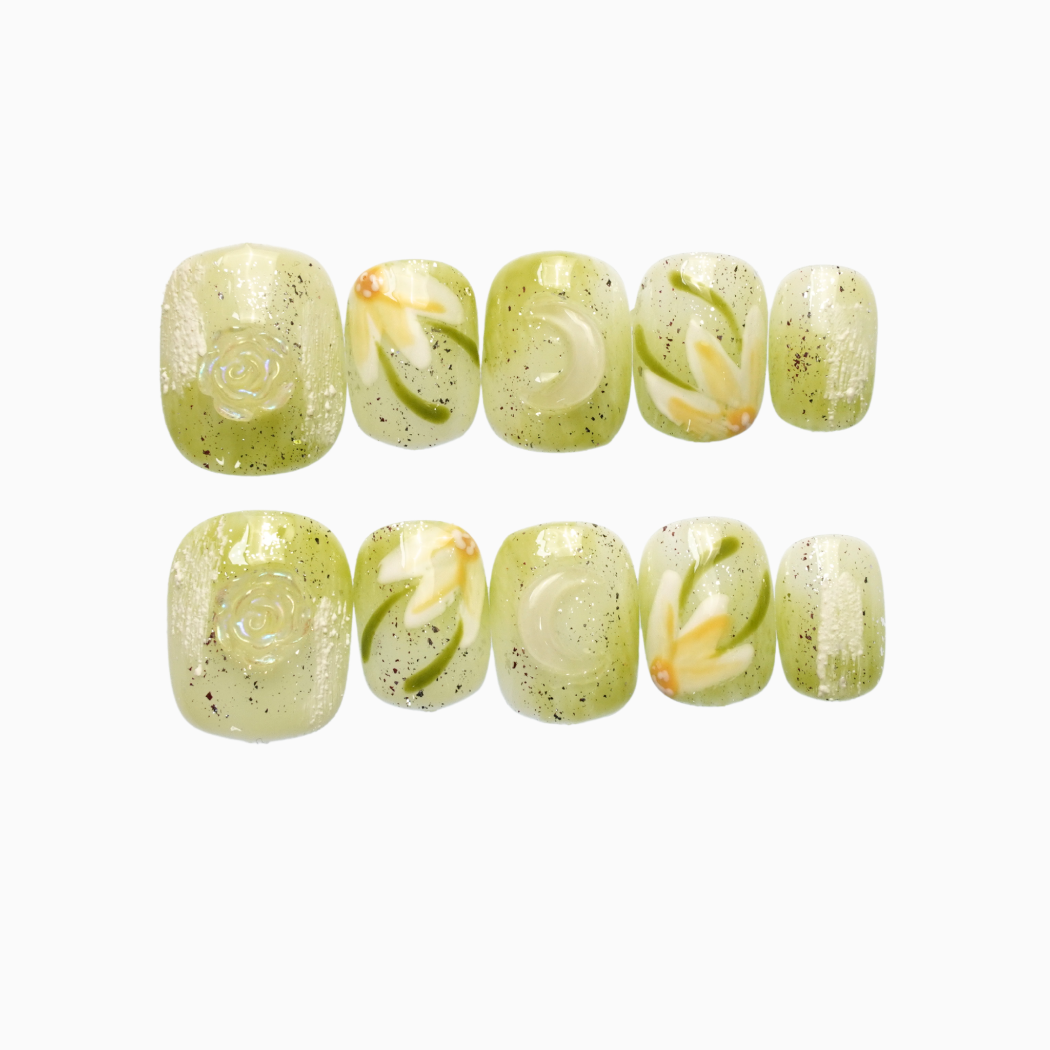 Translucent moss-green with speckled depth, blooming with hand-painted petals and ghostlike roses — like catching wildflowers under fading sunlight.