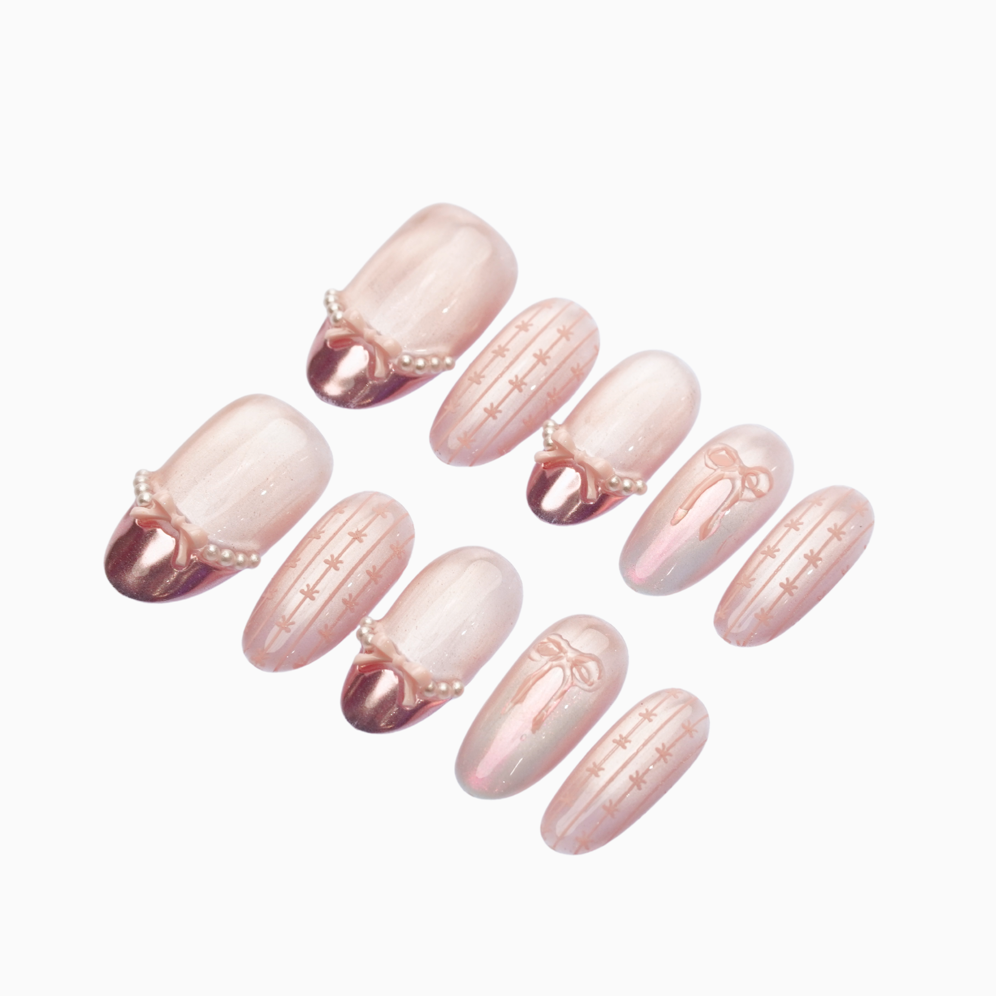 Soft powder-pink hues finished with pearl trims, delicate bows, and subtle shimmer. Light, graceful, and refined with a couture-inspired softness.