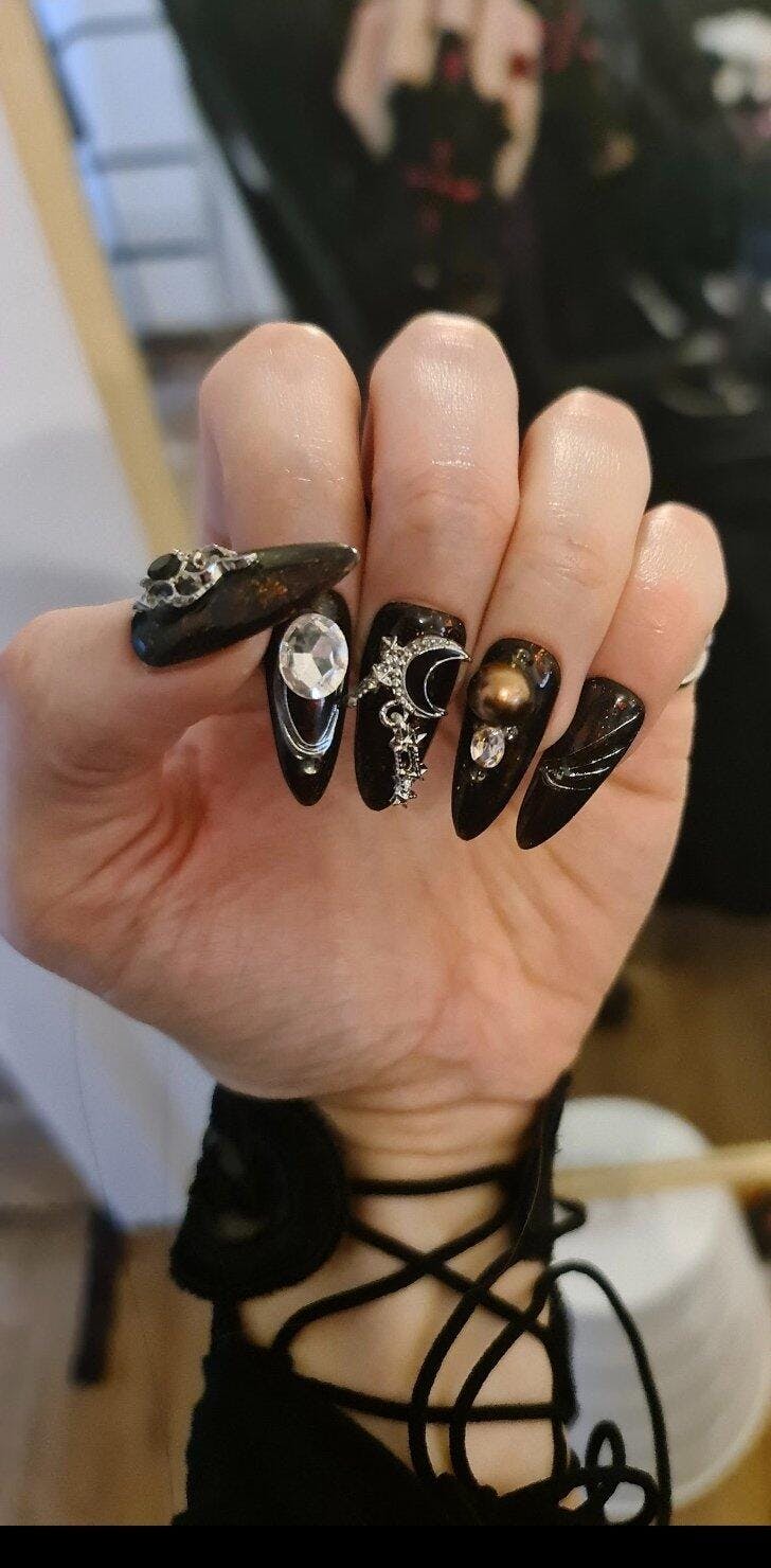 Long, almond style nails with a dark black and burnt copper as the base colours. Adorned with the most detailed gems, including copper pearls, silver gems and the statement moon piece. Also includes artwork of metallic strikes and galaxy embedded glitter.