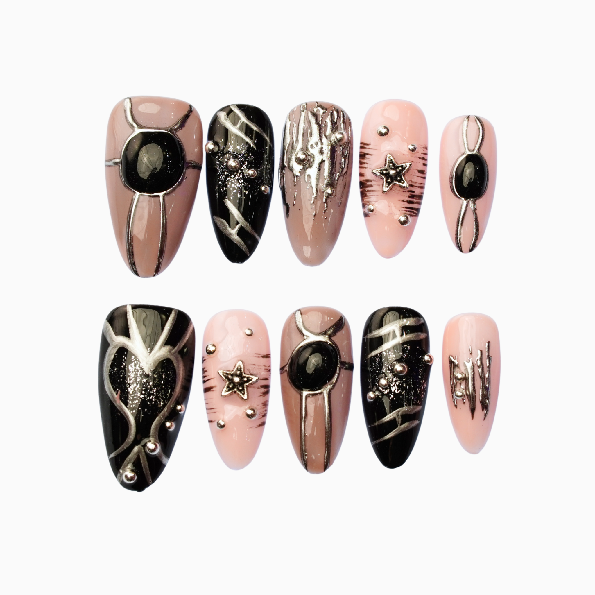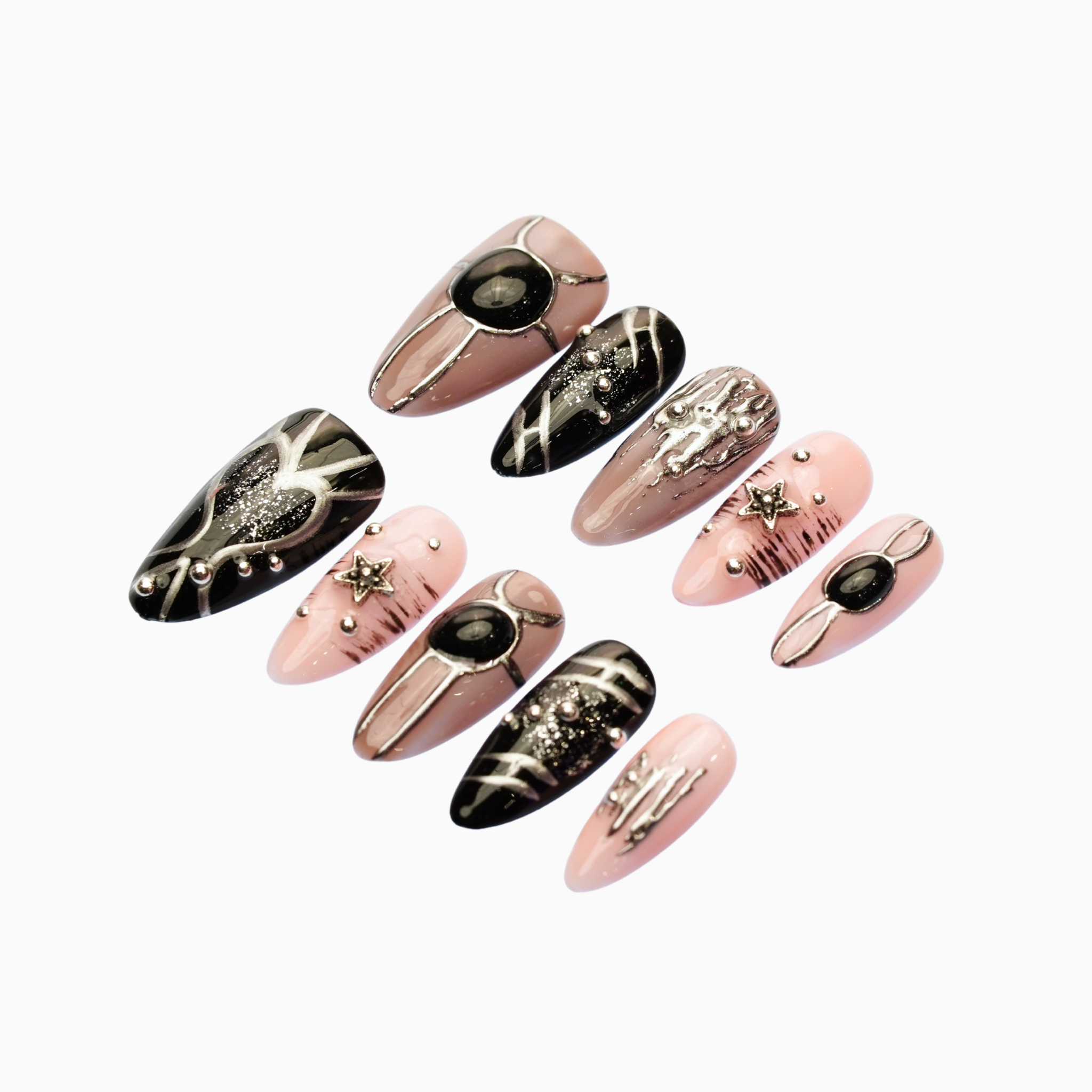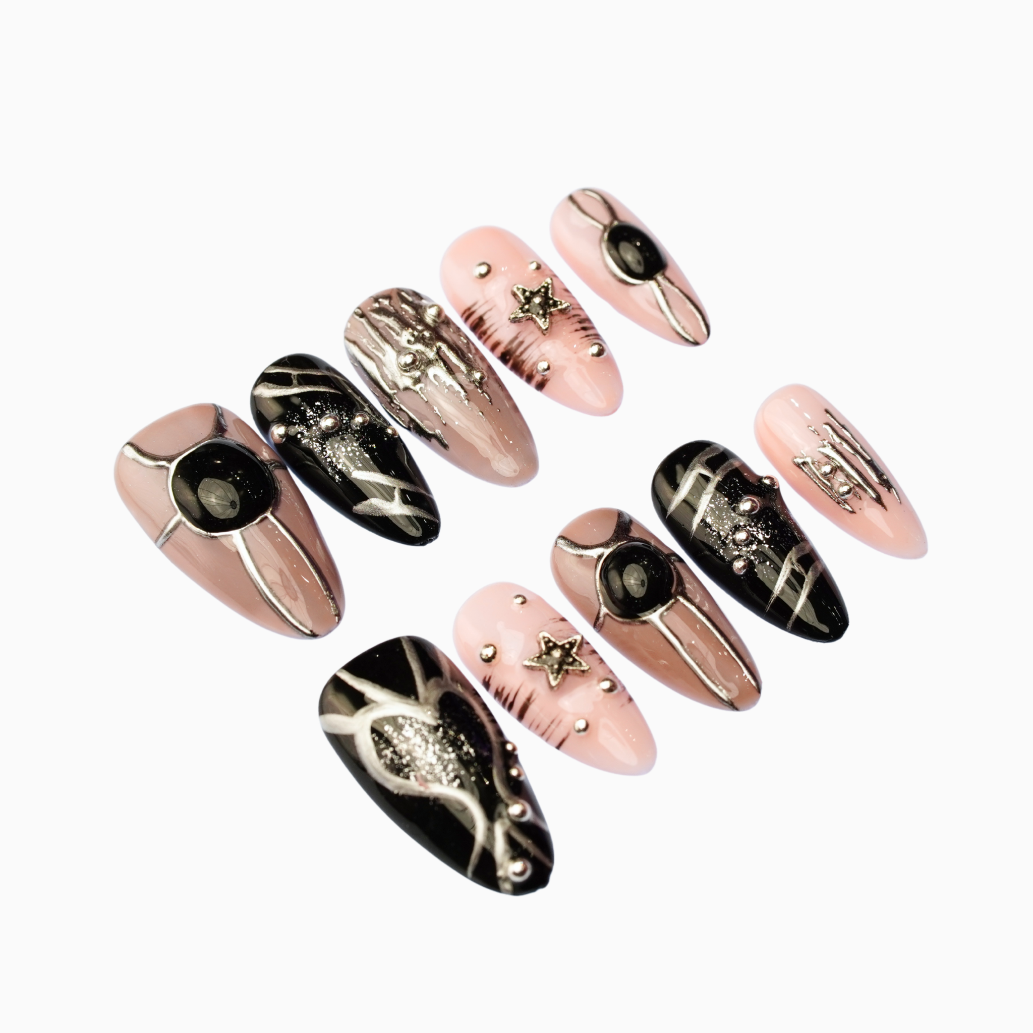 Muted nude pinks and deep black collide through chrome linework, metallic textures, and graphic star details. Futuristic, edgy, and sharply composed.