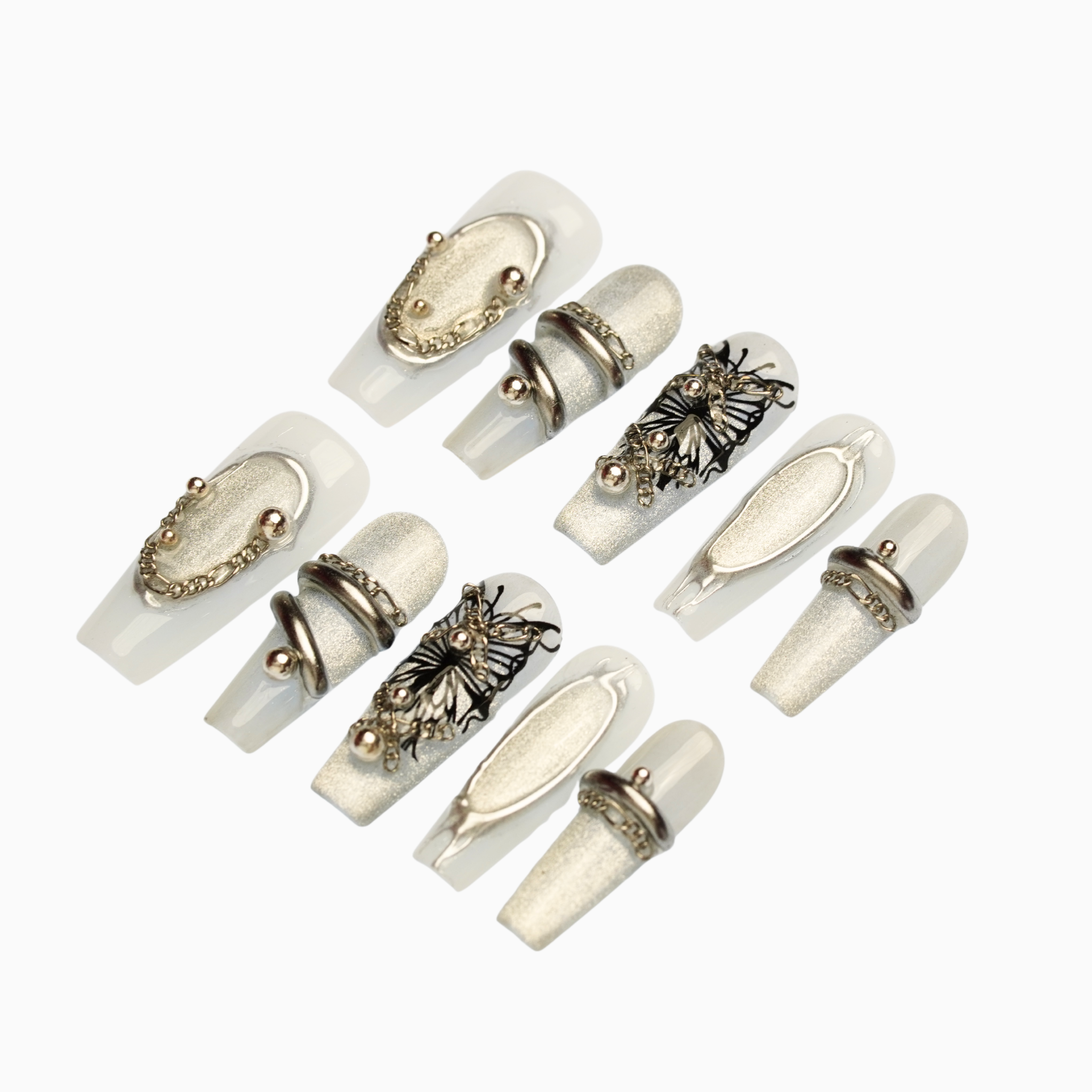 Long-length coffin-shaped nails in a soft metallic silver tone. The nails feature a glamorous arrangement of intricate silver charms and beads, including detailed angel wings and ball studs. The shimmer in the base adds a touch of luxury, making these nails perfect for a formal or glamorous event.